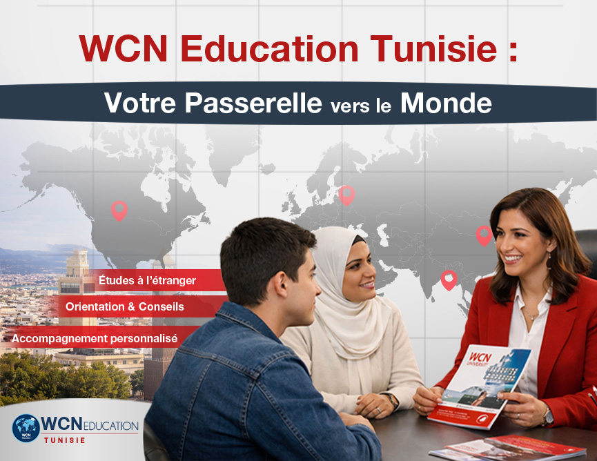 WCN Education est une société spécialisée dans l’accompagnement des étudiants dans la poursuite de leurs études à l’étranger. Nous guidons les étudiants tunisiens et étrangers à chaque étape de leur projet académique, depuis le choix de la destination et de la formation jusqu’à l’inscription dans les établissements partenaires.